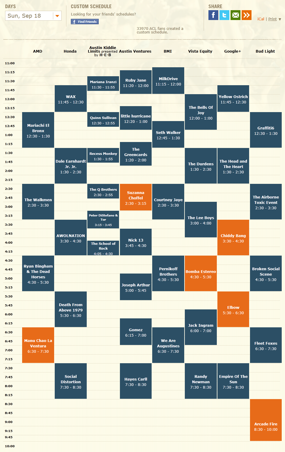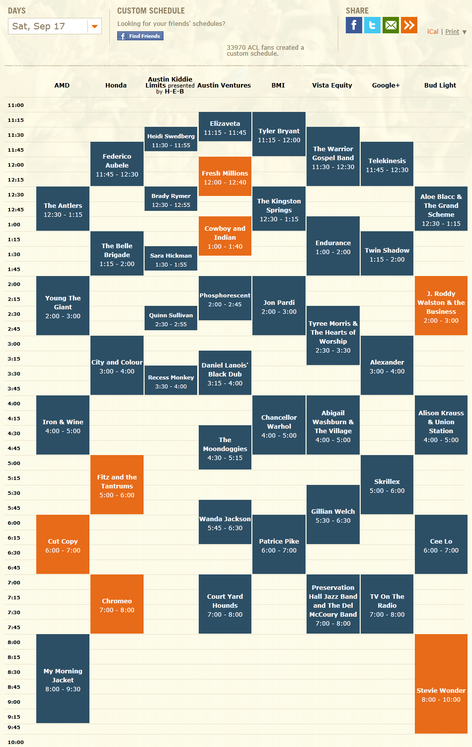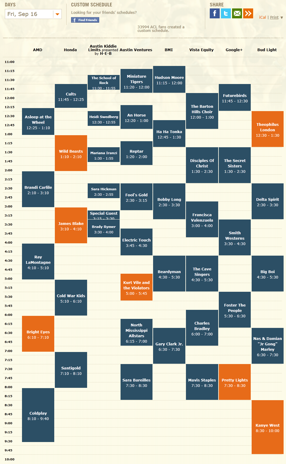 For me, this year’s ACL is all about two things: re-seeing a ton of bands, rappers and singer-songwriters that I love and have seen perform live just within the past year (Theophilus London, Smith Westerns, The Head and the Heart, Gillian Welch, Kanye West and Fleet Foxes to name a few), and seeing a heap of ACL-worthy local talent such as Cowboy and Indian, Fresh Millions, Asleep at the Wheel (who were a ton of fun to see at my first ACL last year) and Suzanna Choffel. I am also incredibly excited, despite the bucolic and relatively reserved nature of the band’s music, to be seeing Iron and Wine live for the first time, intimate setting be damned. I’ve also never experienced the live grandeur of My Morning Jacket, so Saturday will definitely be one for my concert record books. Finally, though I had the chance to see Arcade Fire at the Backyard only a few short months ago, having the opportunity to experience the sounds of “The Suburbs” live once more will undoubtedly be a rare treat. See some of my schedule below, including a stop at the Austin Kiddie Limits stage to check out my 21-month-old buddy Nora’s favorite Pacific Northwest children’s band, Recess Monkey!